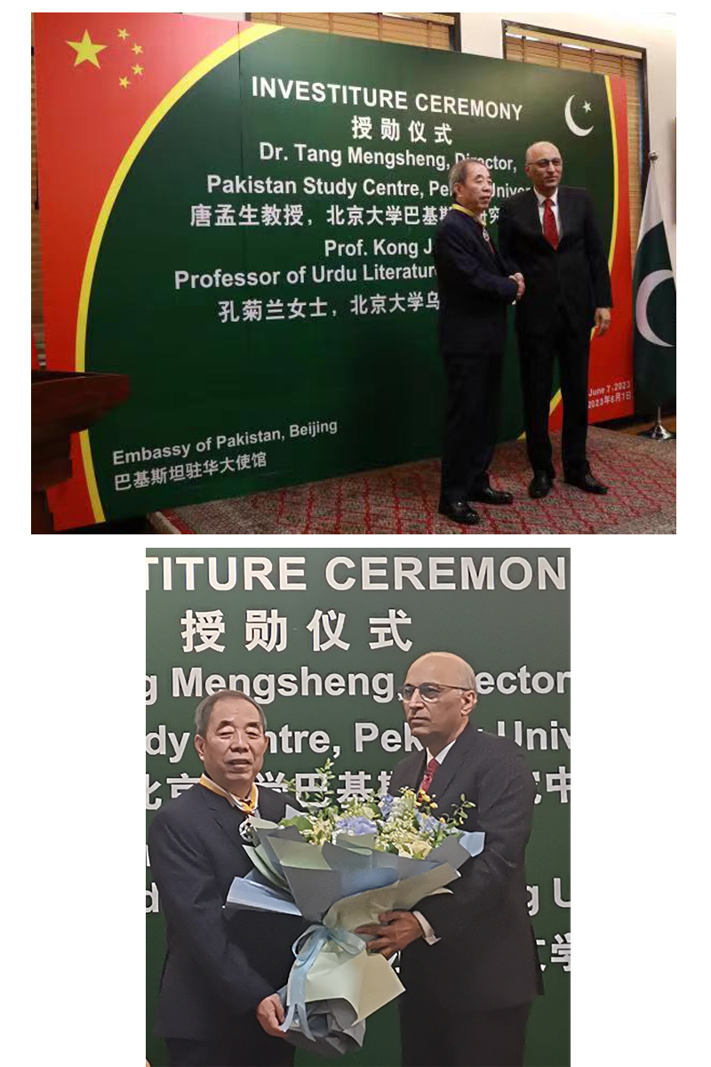 2023年6月7日,巴基斯坦驻华大使馆举办隆重仪式,授予北京大学外国语学院南亚学系唐孟生教授与孔菊兰教授巴基斯坦“卓越之星”勋章,以表彰两位学者在推动乌尔都语教学、增进两国人文交流、增进中巴友谊方面作出的重要贡献。巴基斯坦驻华大使莫因·哈克、政务参赞穆罕默德·卢曼·艾哈迈德、武官Ranna Faisal Rafiq准将、社会福利公使Ijaz Ahmad、科技公使Kamran Rasheed博士,以及中国驻(巴基斯坦)卡拉奇原总领事安启光、三峡集团财务总监王少峰等各界人士出席了授勋仪式。