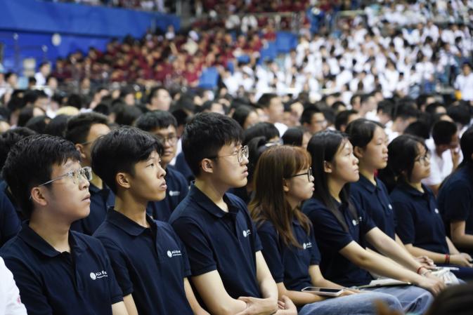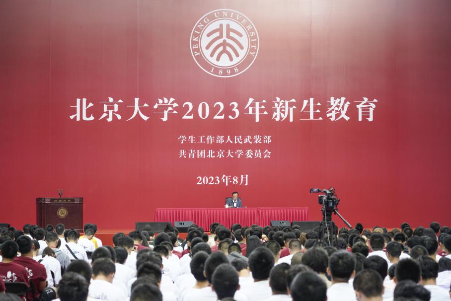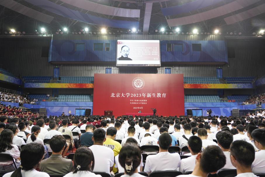 8月27日上午,北京大学党委书记郝平以“传承爱国基因,担当复兴重任,绽放新时代北大人的绚丽青春”为题,为全体2023级本科新生讲授“开学第一课”,北京大学党委副书记、副校长宁琦主持。4000余名师生在邱德拔体育馆共同聆听。