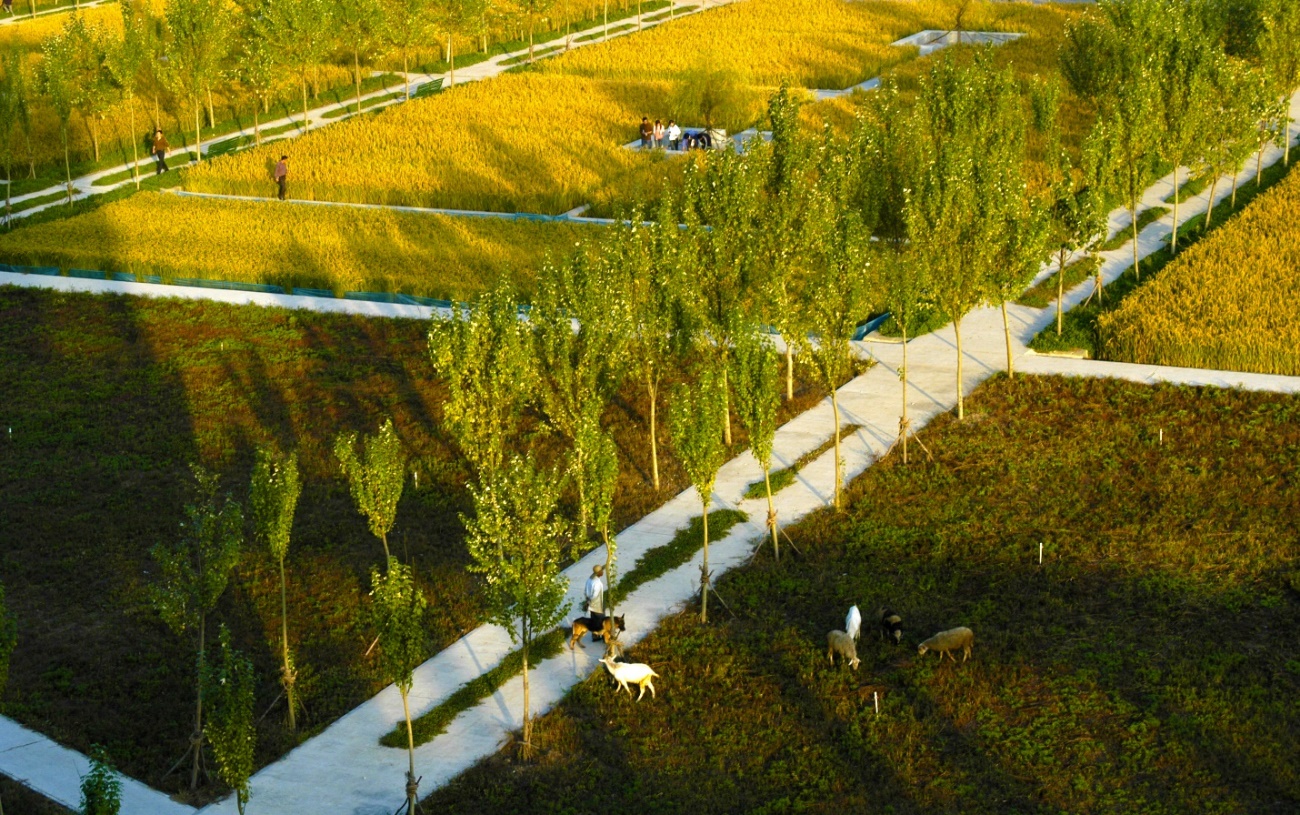 沈阳建筑大学校园(辽宁省沈阳市,2004年 )。该项目利用稻田营造了校园,在城市环境中引入了富有功效的景观。项目旨在提高那些离开农村成为城市居民的大学生对土地和农业的认识,展示了解决当今发展中国家城市发展与粮食生产之间紧张关系的方法。