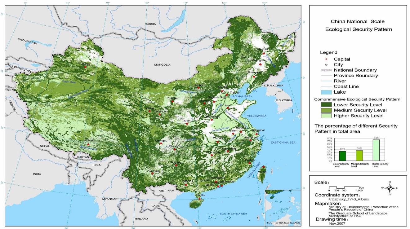 国家生态安全格局规划(2007年)。该规划旨在确定保护自然、生物、文化和休憩过程的关键景观的空间结构,从而保障人类社会所必需的综合的生态系统服务。