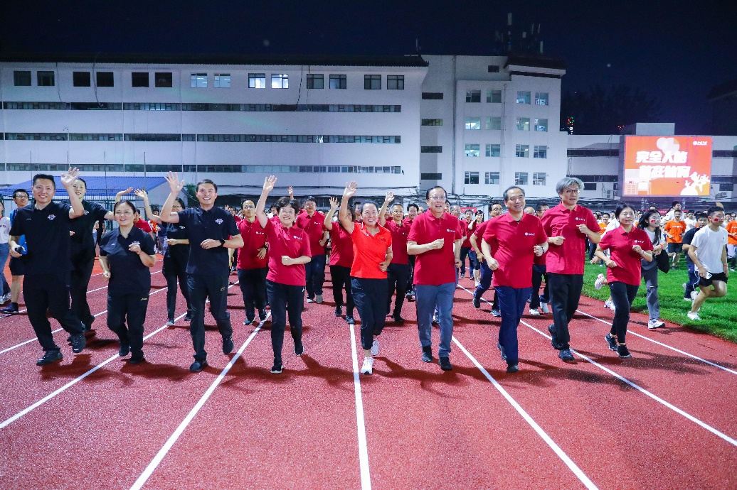 现场师生在体育教研部教师的带领下开展丰富多彩的热身活动。热身活动不仅帮助同学们伸展肢体,以更好的状态投入之后的运动,还让大家在合作互动中拉近了距离、增进了友谊。动感的音乐声、炫目的灯光以及同学们的欢笑声、欢呼声交织在体育场上空,激荡着朝气蓬勃的青春活力。