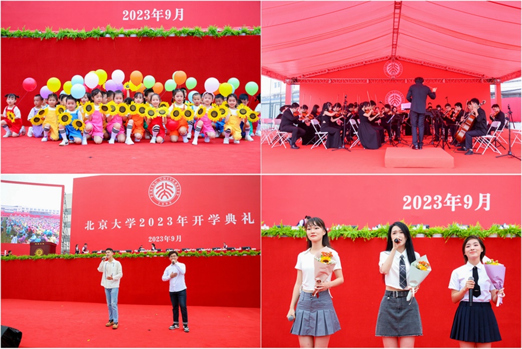 典礼开始前的暖场节目让五四体育场的气氛热烈而充满温馨。舞蹈《孩子的天空》,交响乐《卡门组曲·波西米亚舞曲》,歌曲联唱《听》《难以抗拒你容颜》《起风了》……北大附属幼儿园的孩子们、学生交响乐团的同学们以及校园优秀学生歌手,为大家带来风格各异而精彩纷呈的演出,赢得阵阵掌声。屏幕上播放的开场视频,回顾了从新生报到、军训到新生教育每个环节的难忘瞬间。视频里新生们表达着对新生活的憧憬,引来典礼现场同学们阵阵欢呼和笑声。