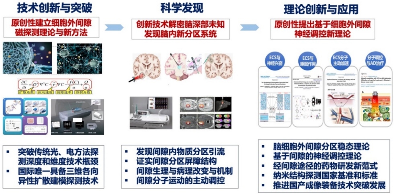 “脑细胞外间隙成像探测技术与应用”是对脑深部细胞外间隙这一人类以往未知的超微结构空间进行技术探测、系统解密和开发利用的研究成果。成果由北京大学第三医院韩鸿宾教授带领跨学科团队完成,由国家杰出青年科学基金、北京市科技计划、国家重点研发计划共同支持,历时15年。脑细胞外间隙是脑神经细胞工作的直接环境,间隙内物质转运决定着睡眠、记忆和感觉形成等重要脑功能活动,以往国际通用的光、电两类探测方法仅能获取脑内两点间或者浅表区细胞外间隙信息,脑深部广阔区域成为人类尚未探及的未知空间,被誉为“神经科学领域尚未攻克的研究高地”,脑病治疗及新药研发因此遭遇瓶颈。针对脑细胞外间隙探测的深度与维度两大难题,韩鸿宾率先提出磁学探测理论,建立了国际上唯一具备三维各向异性建模与定量分析能力的原创性新型探测方法,设计研制的细胞外间隙成像探测仪,突破传统方法在探测维度和深度上的技术瓶颈。凭借新方法独有的技术优势,团队对脑结构有了系列重要的科学发现,其中最为关键的是对脑新分区系统的发现:脑细胞外间隙内组织液呈分区引流。团队在阐明分区屏障结构的基础上,进一步证实分区屏障是决定发育相关认知的关键开关结构。在对脑生理、病理、发育、麻醉、微重力等条件下细胞外间隙改变进行了系统全面的研究分析后,提出脑细胞外间隙分区稳态理论,基于新理论,提出基于细胞外间隙的新型神经调控理论和技术方法。新技术、新发现和新理论在脑病治疗、新药研发和航天医学等多个领域得到实际应用,研究成果推动我国在脑细胞外间隙方向的全球文献贡献量达到国际第二位,团队在该方向的全球学术引文影响力自2017年以来持续排名国际第一,在国际脑超微结构研究的高地上形成中国的领先优势。