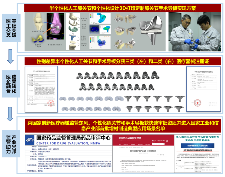 我国全膝置换很快将年超100万例,但临床上多使用进口或仿制标准产品的假体匹配差、截骨面覆盖率低、常过多截骨且远期翻修率高。余家阔教授团队携华南理工大学杨永强教授团队,历时20年,基于国人膝关节影像、术中测量及下肢骨性结构三维测量,完成个性化性别差异设计膝关节假体研发并获三类医疗器械注册证;配套研发的个性化手术导板获得创新医疗器械特别审批资格并获二类医疗器械注册证,并被纳入中华人民共和国工业和信息化部首批增材制造典型应用场景名单。成果使我国在个性化性别膝(半个性化)人工膝关节设计、制造和临床手术各领域居于国际领跑地位。本技术发明的主要创新包括:(1)研发国内外首款股骨、胫骨和聚乙烯垫片均男女差异性设计人工膝关节;(2)完成配套手术导板的研发,是国内外首创基于CT与MRI影像多模态融合建模设计的个性化手术导板,也是全球首款可完成全部TKA操作的手术导板;(3)研发高密度打印和均匀能量分布的专用金属3D打印设备;(4)实现微创个性化全膝置换新术式创新。研发成果2019年实现5000万元转化签约,专用金属3D打印设备销售多家科研和生产单位,创立性别差异和个性化微创术式并在多家医院推广,产生良好的经济和社会效益。