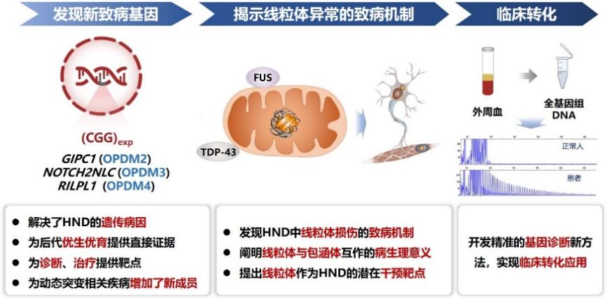 遗传性神经肌肉病(HND)是一组致残、致死率高的神经遗传病,给患者的家庭和社会带来沉重负担,诊断困难和缺乏有效治疗是该类疾病面临的重大临床问题。因此,基于遗传家系资源挖掘新致病基因并揭示其致病机制,是解决HND精准诊断和开发有效干预手段的根本。“遗传性神经肌肉病的新致病基因鉴定和发病机制研究”项目是王朝霞教授及其团队历经10余年取得的重大创新成果。主要发现包括:(1)首次发现一种遗传性包涵体肌病—眼咽远端肌病(OPDM)的三个新致病基因(GIPC1、NOTCH2NLC、RILPL1),解释了70%以上OPDM患者的遗传病因,解决了该病困扰临床数十年来的基因诊断问题;(2)率先发现肌萎缩侧索硬化相关FUS蛋白通过HSP60蛋白介导定位线粒体,与线粒体ATP合成酶亚基ATP5B相互作用引起氧化磷酸化功能异常,导致神经肌肉变性;(3)首先发现TDP-43蛋白进入线粒体激活其未折叠蛋白反应从而导致线粒体损伤的致病机制,为TDP-43蛋白相关神经肌肉病的治疗提供理论基础。以上发现提高了我国在HND诊断和干预研究的国际影响力,相关研究成果已发表SCI论文30篇,包括PNAS等国际期刊,多次被Cell、Nature等国际期刊引用。该成果得到国家自然科学基金、北京市自然科学基金等15项课题资助。