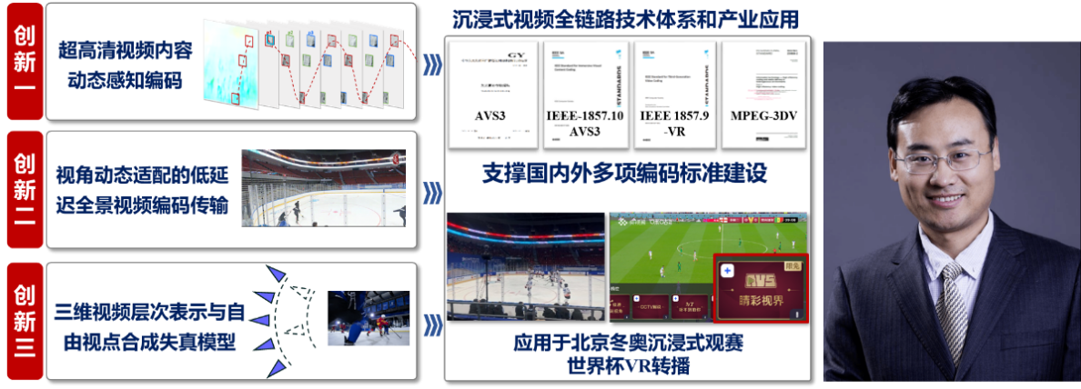 沉浸式视频是未来视频产业的主战场,“十四五”规划《纲要》指出“加快提升超高清电视节目制播能力,推进电视频道高清化改造,推进沉浸式视频、云转播等应用”,沉浸式视频编解码技术是产业发展的关键。项目组主要研究创新点包括:(1)提出了超高清视频内容动态感知编码技术,编码效率提升30%,研制了8K超高清视频实时编解码系统,支撑了我国首个超高清频道CCTV-8K开播;(2)提出了视角动态适配的全景视频编码传输方法,研制了端到端交互式低延迟全景直播系统,应用于北京冬奥会赛事直播,首次实现全景、交互式自由视点观赛;(3)构建了三维视频层次表示与视点合成失真模型,研制了交互式多维观赛直播系统,支持高达60路自由视点视频实时编码传输,受到奥组委高度评价。项目授权发明专利102项,牵头制定了自主的8K超高清视频编码标准AVS3,被DVB采纳为国际标准,制定了沉浸式视频标准IEEE1857.9;成果应用于央视、咪咕、数码视讯等单位,形成了“技术标准-系统装置-产业应用”完整产业链,产生了巨大的经济社会效益,入选世界互联网大会科技领先成果。培养国家杰出青年科学基金、万人计划、长江学者计划入选者各1人,国家优秀青年科学基金入选者2人,研究生70余人,形成了我国沉浸式视频产学研深度融合、具有重要国际影响力的创新团队。