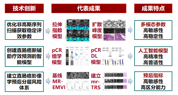 直肠癌是威胁中国人群健康的主要癌症之一。影像学检查是直肠癌疗效评价和预后监测的主要无创手段,但形态学指标不能早期、敏感反映疗效和提示预后,难以实现精准诊断。针对这一难题,北京肿瘤医院医学影像科孙应实教授团队在直肠癌磁共振扩散加权成像非高斯模型算法探索、人工智能辅助诊断,影像学预后风险要素确立方面开展了以技术创新为核心、以临床应用为目标的系统研究。团队率先将磁共振扩散加权拉伸指数模型应用于直肠癌新辅助治疗早期评效,开展多种非高斯模型扩散成像算法的创新应用;结合影像组学和深度学习技术,创建直肠癌疗效和进展预测的人工智能辅助模型,并完成模型的大样本、多中心临床验证;提出基线MR检出的直肠癌壁外血管侵犯(EMVI)、建立影像学病理退缩分级评分(mrTRS)等影像学预后风险要素,推动直肠癌预后分层风险系统的构建。相关成果发表中英文论文50篇,包括放射学顶刊Radiology,取得发明专利3项。本成果中影像学创新技术已推广到全国10省市20家医院,应用于超5000名直肠癌肿瘤患者,显著提升我国直肠癌的影像学诊断能力。成果写入多部直肠癌诊疗指南和专家共识,有效推动了精准医疗的发展,为影像医学和肿瘤防治作出了杰出贡献。