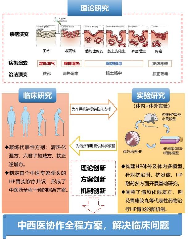 幽门螺杆菌(HP)感染是我国胃癌的最主要病因,是胃癌最重要可控的危险因素。但严重的胃黏膜萎缩即使在HP 根除后依然与胃癌密切相关且缺乏有效干预手段。“HP-胃炎-癌前病变中西医协作诊疗体系的创建和推广应用”项目岐黄学者张学智教授及其团队在多项国家级及省级课题资助下和医企联合下,形成的HP胃炎-癌前病变中西医协同诊治中药创新成果。该成果提出HP胃炎存在“脾胃湿热-脾虚郁滞-正虚毒盛”的病机规律,确立了“清热调中-培土畅中-扶正攻毒”三步治法,并原创了清热化湿方、加减六君子方、扶正逆增方代表方药,为HP胃炎治疗提供了创新药物和方案;基于临床疗效,利用体内外多种模型,首次从抗HP黏附、抗生物膜形成等多角度阐释了代表性药物治疗HP胃炎的新机制,发现了中药抑杀HP不易产生耐药的特性;牵头制定首个HP胃炎中西医协作诊疗共识,从诊断、治疗、调护、随访多方面形成了中医药全程干预的综合方案,明确推荐了中西医结合具体用药方案,促进了HP胃炎中西医协作诊治规范化。研究成果获得科技发明专利2项、著作权登记1项。HP胃炎中医认识及中西医协作方案通过专家共识意见的形式,被国内多家单位临床应用;建设了北京市中西结合研究所幽门螺杆菌研究中心。研究成果为HP领域西医知名专著及中医内科学教材所引用,并被《中国中医药报》报道为“中医药突破幽螺杆菌治疗瓶颈”。