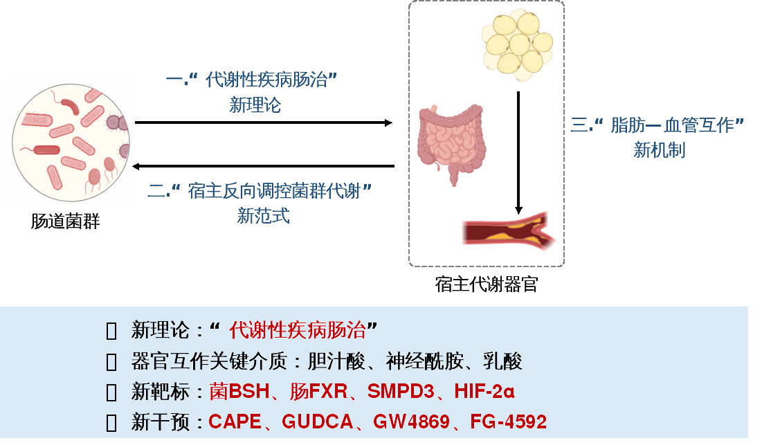 当前,代谢性疾病已成为全球重大公共卫生问题,严重危害国民生命健康。在我国,代谢性疾病的发病率逐年上升,尚未达到拐点。“健康中国2030”规划已对代谢性疾病发起“攻坚战”,明确了2030年降低代谢性疾病过早死亡率30%的防治目标。“代谢性疾病的发病机制与干预策略研究”项目是姜长涛教授及其团队多年探索取得的重大创新成果。该项目提出了“代谢性疾病肠治”的新理论,描绘了调控代谢性疾病的肠道共生菌及其代谢物特征图谱,揭示了肠道菌群的代谢物胆汁酸与神经酰胺介导的器官互作是多种代谢性疾病的共性发病机理;提出了宿主反向调控菌群代谢的新范式;揭示了脂肪—血管跨器官互作的新机制。发现菌源BSH,肠FXR、SMPD3,脂肪HIF-2α等多个代谢性疾病的新靶标及相应候选药物CAPE、GUDCA、GW4869、FG-4592。成果发表于Nature Medicine、Cell Metabolism等,获授权发明专利3项,应邀参加Cell Metabolism杂志举办的“Cell Press Live:代谢性疾病中国研究进展”研讨会并接受人物专访。共同参与成立了中国生物物理学会肠道菌群分会,推动了中国肠道菌群科学研究。