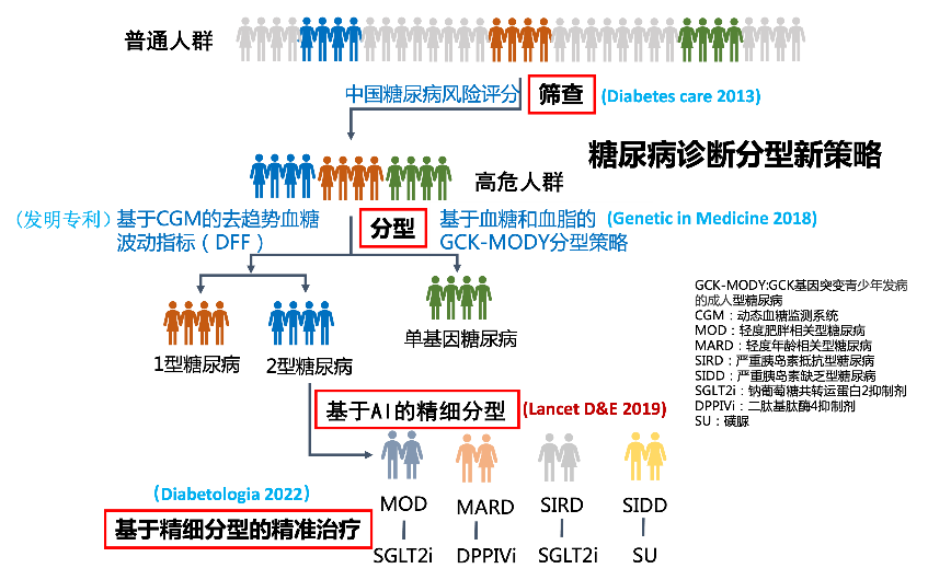 糖尿病是一种高度异质性疾病,早筛查、早治疗、准确分型和个体化治疗是糖尿病防控的主要策略。在长达10余年的长期实践中,本科室建设了糖尿病全程的精准筛查及治疗体系。具体包括:(1)创立了中国2型糖尿病风险评分系统,该评分采用简单的病史及体格检查的结果,具有简便易行、易操作的优点,此系统已在全国范围内广泛应用,被多部指南引用;(2)采用连续葡萄糖监测技术(CGM),建立了1型糖尿病辅助诊断策略。这一策略通过新的数学算法提供了1型和2型糖尿病鉴别的新方法;(3)创立了基于稳定轻度高血糖和血清甘油三酯水平的葡萄糖激酶突变糖尿病(GCK-MODY)临床筛查策略。这种策略提升了对GCK-MODY的诊断率,降低了基因诊断的成本,能显著减少误诊误治,易于推广。此外,解释了GCK-MODY的CGM特征,解释了该型糖尿病并发症较少的机制;(4)通过数据驱动建立了2型糖尿病的聚类分型策略及精准治疗方案。这一策略使我们能够将2型糖尿病患者细分为4种亚型,初步建立了“先分型,后治疗”的精准医疗体系。该体系其中1项专利已获授权,发表多篇SCI文章,其中5篇文章发表于Lancet子刊等期刊。