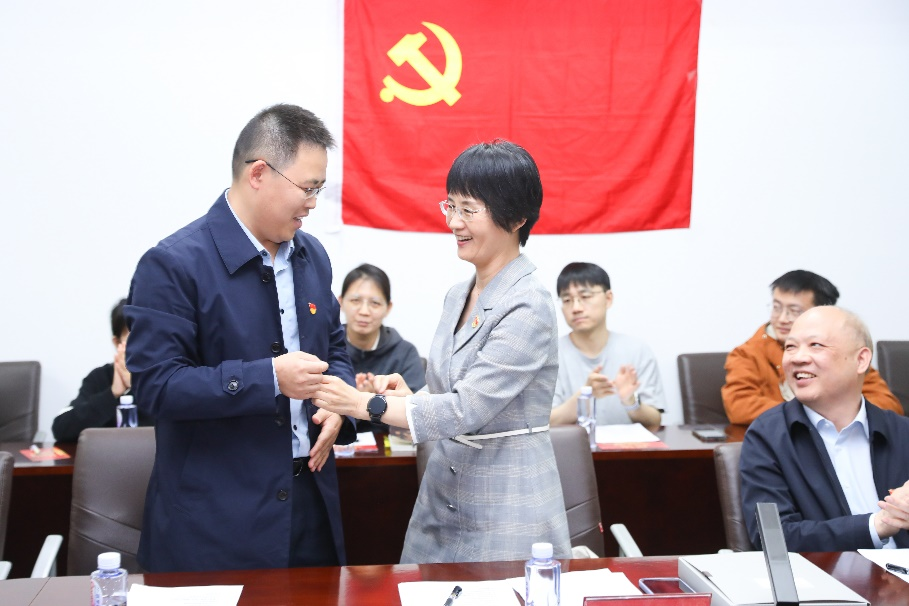 物理学院现代光学研究所党支部书记杨宏为刚刚成为中国共产党预备党员的肖云峰教授佩戴党徽
