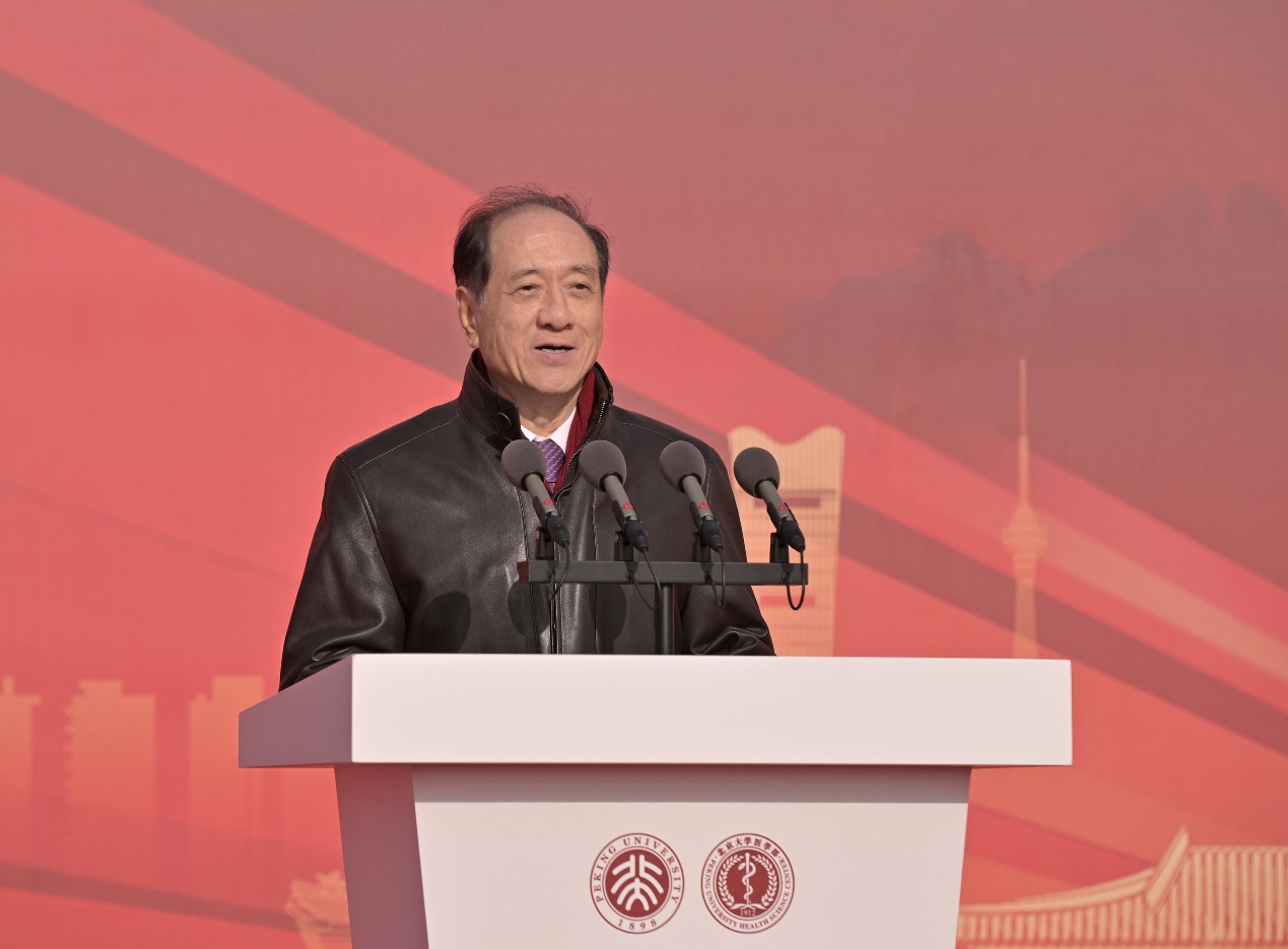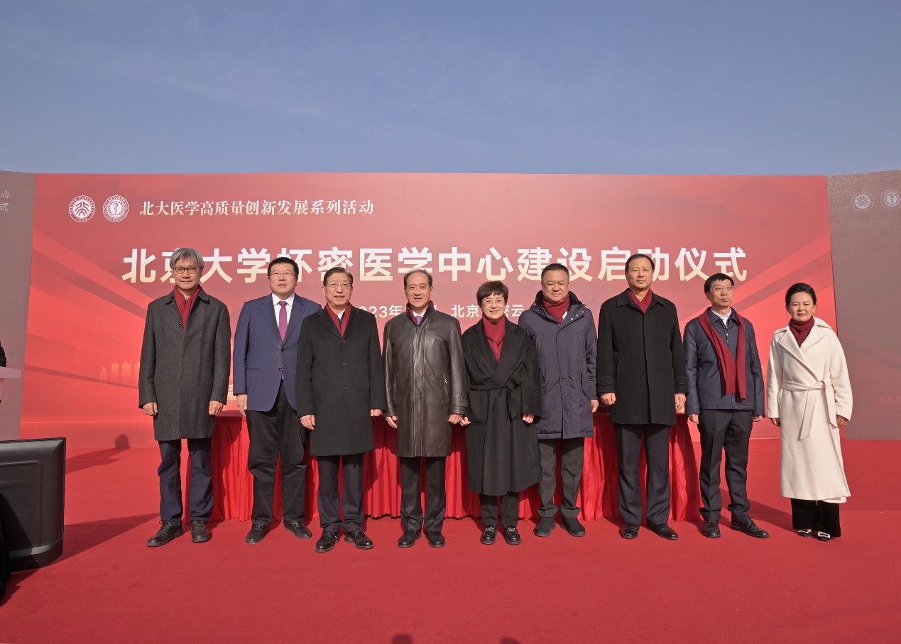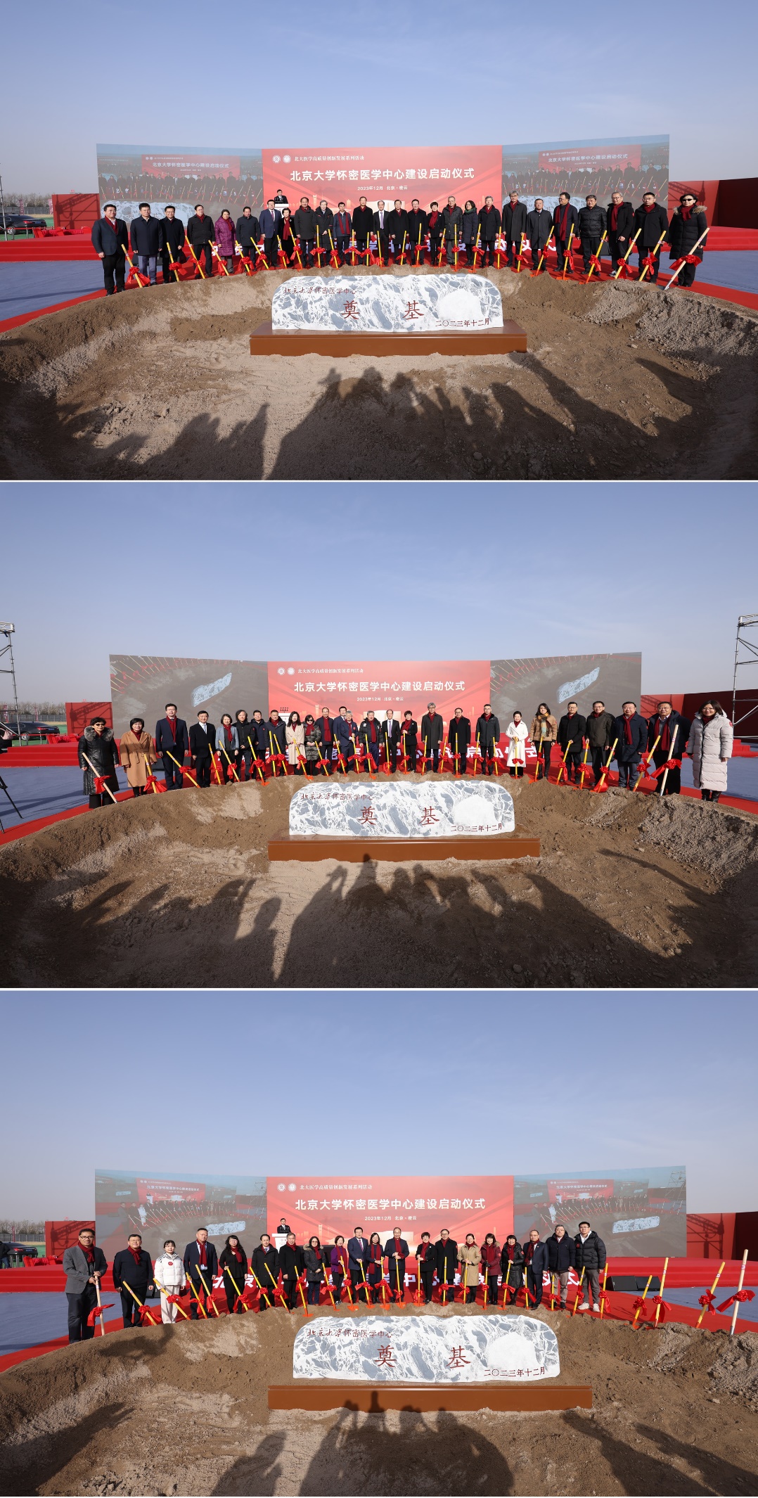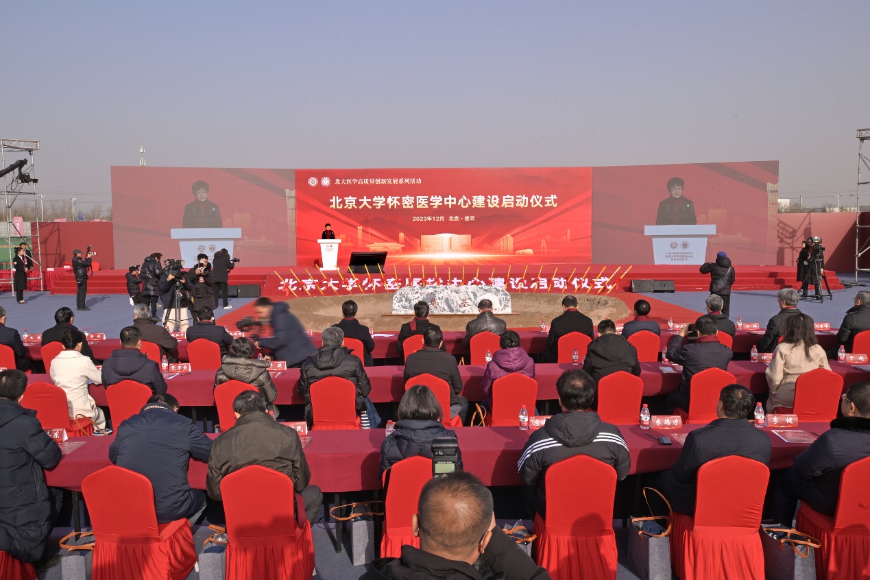 绿水环抱,群山拥簇,北京大学怀密医学中心在这个阳光明媚的冬日,开启了高水平建设、高质量发展的“北大速度”。第十、十一届全国人大常委会副委员长、第十二届全国政协副主席、中国科协名誉主席、中国科学院院士韩启德,国家卫生健康委党组副书记、副主任、中国科学院院士曾益新,教育部党组成员、副部长孙尧,北京市委常委、常务副市长夏林茂,宁夏回族自治区党委常委、常务副主席陈春平,北京大学党委常委、常务副校长、医学部主任、中国工程院院士乔杰,密云区委书记余卫国,密云区区长马新明,北京大学党委常委、副校长王博,北京大学原常务副校长、医学部原常务副主任柯杨,北京大学原党委副书记、医学部原党委书记敖英芳,中国科学院院士、北京大学国家生物医学成像科学中心主任程和平,中国科学院院士、北京大学第六医院院长陆林,中国工程院院士、北京大学人民医院院长王俊,中国工程院院士、药学院教授张强等领导嘉宾,来自国家部委、北京市、密云区、北京大学相关负责同志,北京大学专家学者代表、名誉校董代表、师生代表、参建企业代表,以及长期关心、支持北京大学发展建设的各界人士共同见证这一激动人心的时刻。仪式由北京大学党委常务副书记、组织部部长、医学部党委书记陈宝剑主持。