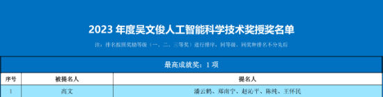 2024年3月7日,中国人工智能学会发布《2023年度吴文俊人工智能科学技术奖奖励公告》,中国工程院院士、北京大学计算机学院博雅讲席教授高文获得“吴文俊人工智能科学技术奖最高成就奖”。