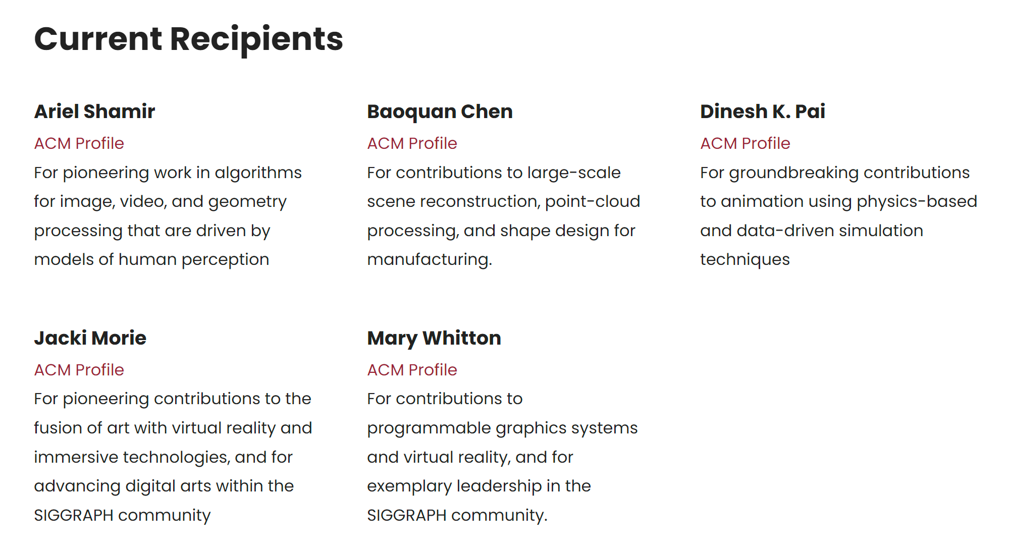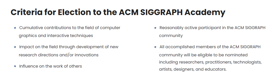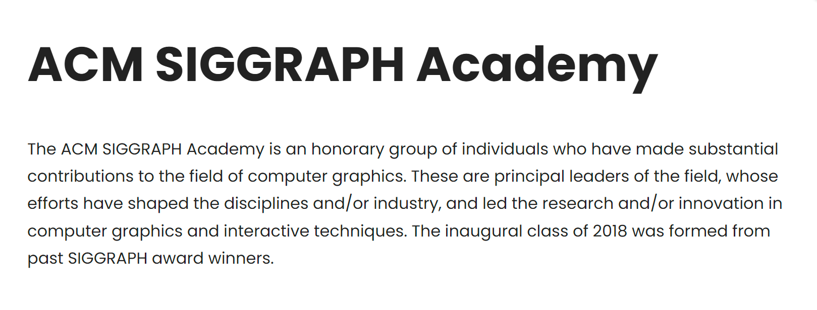 首届ACM SIGGRAPH Academy入选的会员为该会议历史上终身成就奖和杰出贡献奖获得者,此后每年通过推荐、评选产生,历史累计入选者共计92人。据ACM官网介绍,入选学院的标准包括:对计算机图形学和交互技术领域研究作出突出贡献;开创新的研究方向或对研究领域产生卓越影响;代表性/具有启发性的研究工作;积极参与社区活动当然,除了技术创新外,能够入选Academy的也有艺术、教育、服务以及技术实践等方面的杰出贡献者。
