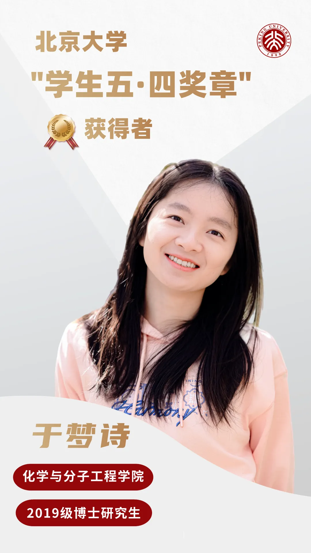 于梦诗曾获国家奖学金、北京大学校长奖学金、北京大学年度人物、北京大学三好学生、北京大学优秀科研奖、化学与分子工程学院“化学之星”等荣誉与奖励。