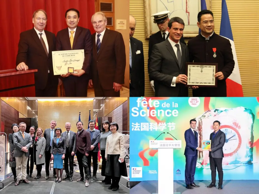 左上:顾晋教授当选法国国家外科科学院外籍院士,右上:董强教授获颁法国“荣誉军团骑士”勋章,左下:段映虹教授获法兰西“学术棕榈”骑士勋章,右下:法国科学节在华首位推广大使朴世龙院士获赠纪念证书