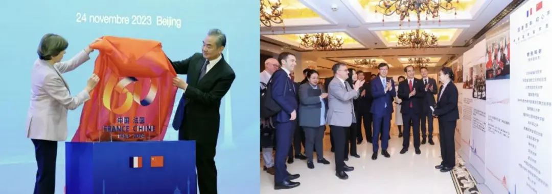 2023年11月24日,中法人文交流机制中方牵头人、外交部长王毅同法方牵头人、法国外交部长科隆纳在北京共同主持召开机制第六次会议(左),机制配套活动“回首百年·初心不变”——中法百年留学座谈会暨图片展在北京大学英杰交流中心月光厅举行(右)