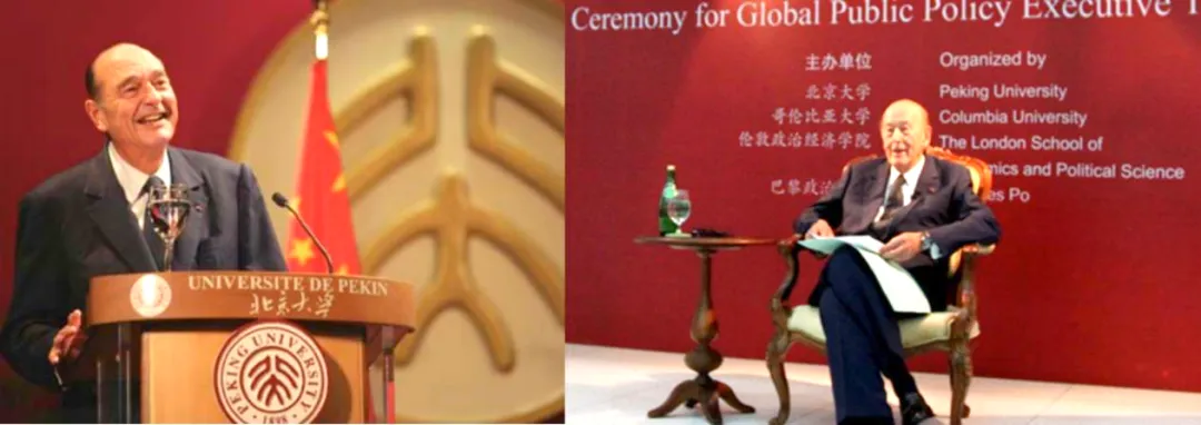 2006年,时任法国总统希拉克访问北京大学并发表演讲(左),2012年,法国前总统吉斯卡尔·德斯坦院士在北大发表演讲(右)