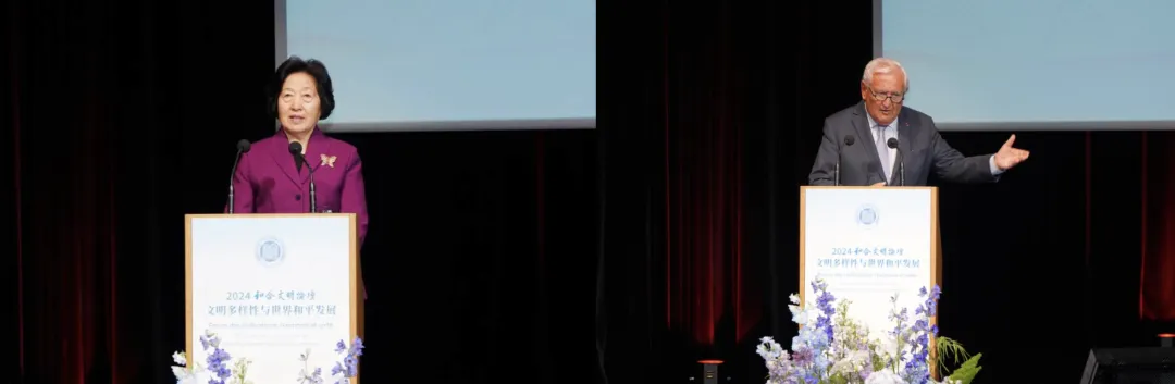 2024年5月21日,由国际儒学联合会、中国人民对外友好协会、北京大学、法国展望与创新基金会共同主办的“2024和合文明论坛”在法国巴黎吉美国立亚洲艺术博物馆举办。国务院原副总理、国际儒学联合会会长孙春兰(左),法国前总理、展望与创新基金会主席拉法兰(右)出席论坛开幕式并致辞。
