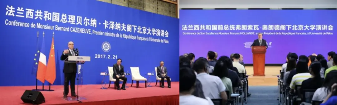 2017年,时任法国总理贝尔纳·卡泽纳夫访问北京大学并发表演讲(左),2018年,法国前总统弗朗索瓦·奥朗德访问北京大学并发表“欧洲一体化”主题演讲(右)