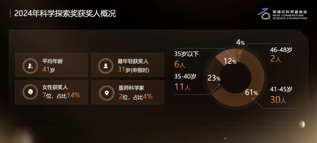 “科学探索奖”于2018年设立,由杨振宁、饶毅、施一公、潘建伟、谢晓亮等14位知名科学家,与腾讯公司创始人马化腾共同发起。它是一项由新基石科学基金会出资、科学家主导的公益奖项,是目前国内金额最高的青年科技人才资助项目之一。奖项支持在中国内地及港澳地区全职工作的青年科技工作者,鼓励他们心无旁骛地探索科学“无人区”。“科学探索奖”评审委员会每年选出不超过50名、男性45周岁及以下、女性48周岁及以下、在中国内地及港澳地区工作的青年科技工作者,每位获奖人在5年内获得总计300万元人民币奖金,且可自由支配。2024年“科学探索奖”仍然设置10个领域,包括数学物理学、化学新材料、天文和地学、生命科学、医学科学、信息电子、能源环境、先进制造、交通建筑、前沿交叉。