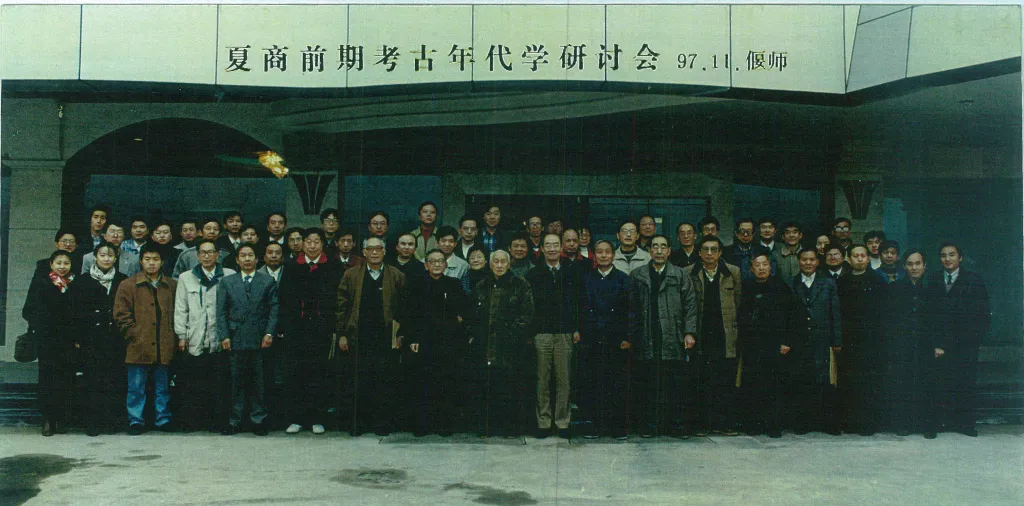 ▲1997年11月,李伯谦(前排左五)在偃师参加夏商周断代工程“夏、商前期考古年代学研讨会”