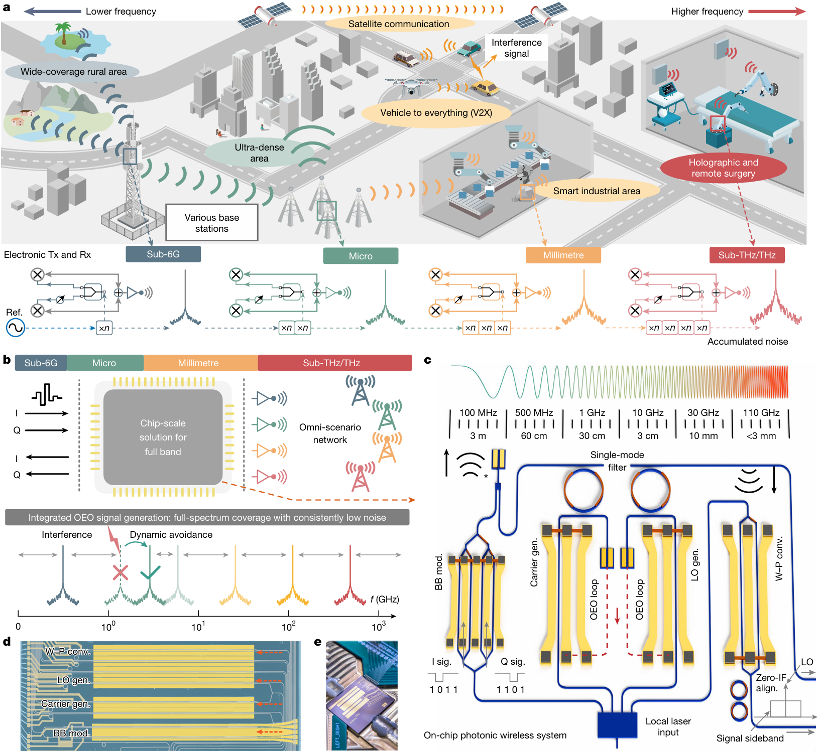 北京大学电子学院王兴军教授、舒浩文研究员和香港城市大学电气工程学院王骋教授联合团队在下一代无线通信(6G)和光电融合领域取得重大突破,首次实现基于光电融合集成芯片的自适应全频段高速无线通信。2025年8月27日,相关研究成果以《全频段无线通信的超宽带集成光电融合芯片》(“Ultrabroadband on-chip photonics for full-spectrum wireless communications”)为题,在线发表于国际顶级学术杂志《自然》(Nature)上。
