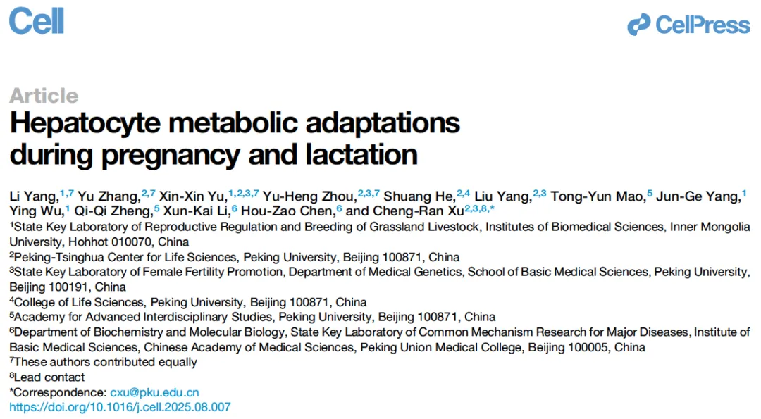 2025年8月28日,北京大学基础医学院、北大-清华生命科学联合中心、女性生育力促进全国重点实验室徐成冉课题组联合内蒙古大学,在学术期刊Cell发表题为“Hepatocyte metabolic adaptations during pregnancy and lactation”的研究论文。该研究系统揭示了母体肝脏在妊娠与哺乳期通过动态代谢调控实现能量分配的机制,为生殖医学和畜牧业发展提供了全新的理论框架与潜在应用前景。