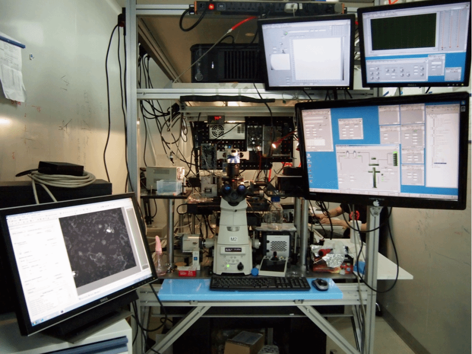 Aaron和黄岩谊组里另一位博士后赵亮,以及他们的显微镜,摄于2012年