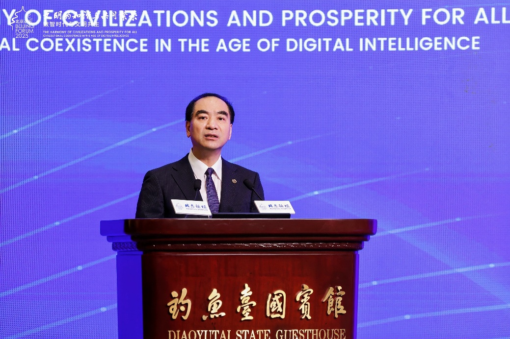 龚旗煌在致辞中指出,北京论坛自2004年创办以来,始终以“文明的和谐与共同繁荣”为宗旨,构建起跨地域、跨学科、跨文化、跨语言的学术共同体。当下,面对数智浪潮带来的深刻影响,大学应主动承担文明传承和创新的使命,以开放办学开创文明交融新格局,以技术赋能搭建文明互鉴新平台,以智慧育人肩负文明共生新使命。希望本届论坛继续发挥好桥梁作用,共同推动落实四大全球倡议,为构建人类命运共同体作出新的更大贡献。