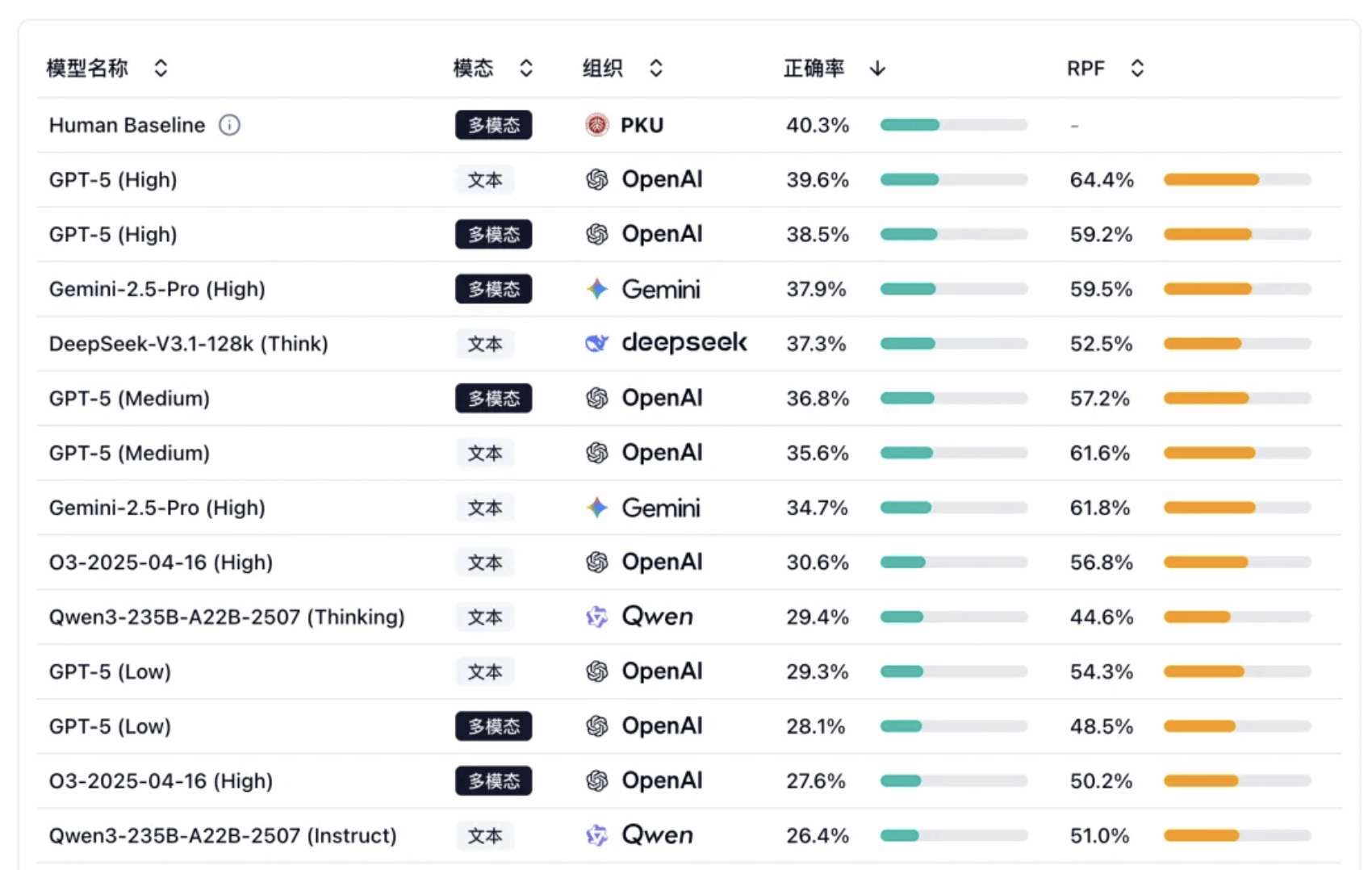 在这场精心设计的考试中,人类展现出了复杂的科学直觉。作为基线,参与测试的北大化院本科生取得了40.3%的平均准确率。这个数字本身,就足以说明这套题目的硬核程度。