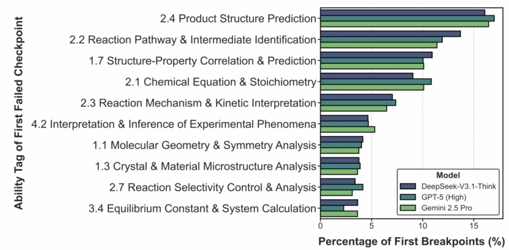 团队发现,AI的推理链条往往断裂于产物结构预测、反应机理识别以及构效关系分析等高阶任务。当前的顶尖模型虽然拥有海量的知识储备,但在处理需要严密逻辑和深刻理解的硬核化学问题时,仍显得力不从心。