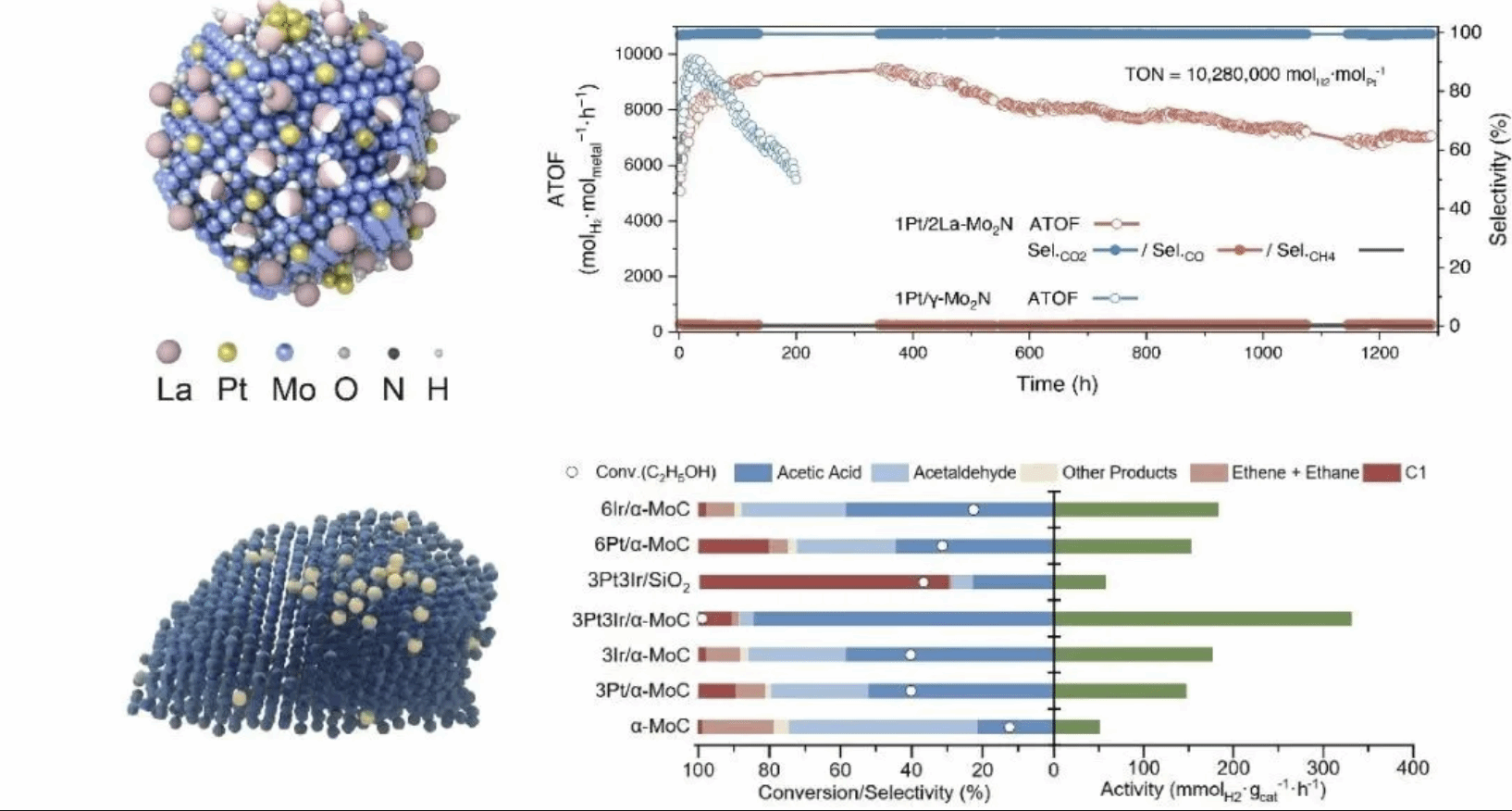 另一研究则聚焦于乙醇和水分子重整的零碳排放制氢路径。团队开发了一种高效的Pt-Ir/α-MoC界面催化剂,除目标产物氢气外,还能使反应生成高附加值的乙酸,同时整个过程实现了零CO₂排放。该研究成果不仅为可持续氢能经济提供了新的解决方案,也为未来氢气生产与储存技术的发展开辟了新方向,为零碳排放的工业制氢奠定了坚实的科学基础。