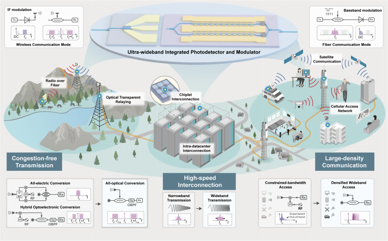 近年来,随着AI技术的快速发展,更高密度、更高性能算力成为未来人工智能领域竞争中的关键一环。如何实现算力芯片间及大规模数据中心内更高速的互联成为制约算力资源发展的重要瓶颈。与此同时,星地通讯、智能网联汽车等日益增长的泛在接入需求对以太赫兹(THz)通信为代表的下一代移动通信技术提出了更高容量和更低时延的挑战。此外,面向未来“万物互联”时代,一个电信通讯网络中的长期痛点也愈发突出:光纤通信与无线通信在信号架构与硬件约束上存在带宽鸿沟,阻碍了统一的系统设计,导致两者难以在同一套基础设施上实现高速且兼容的端到端传输。