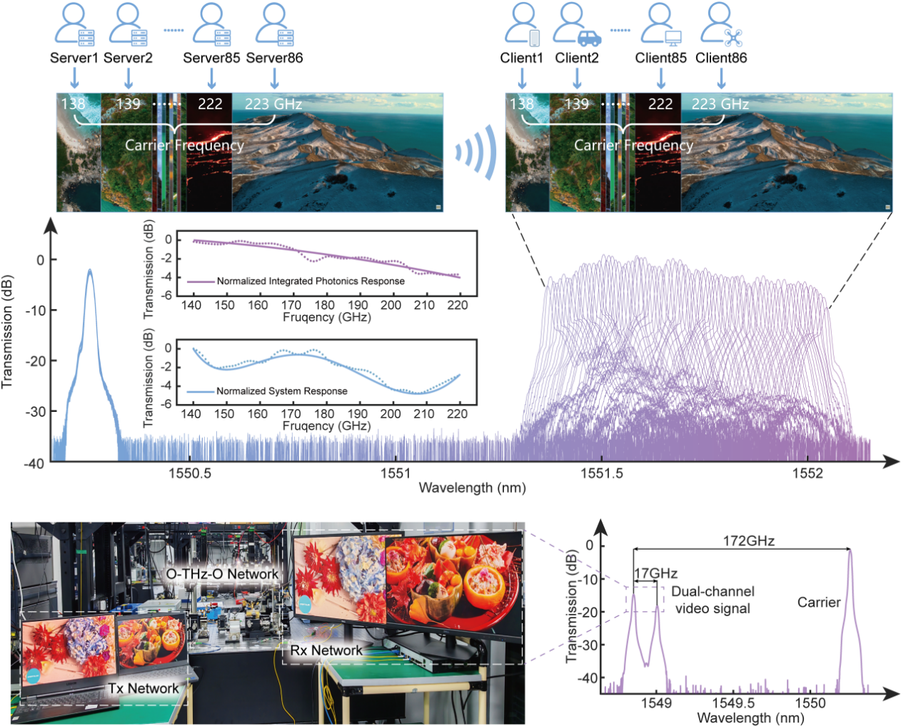 研究团队采用集成光学方案,实现了250GHz以上超大带宽的光电/电光转换器件,薄膜铌酸锂调制器(TFLNMZM)和磷化铟探测器(InP UTC-PD)带宽均创纪录。基于上述器件,研究团队实现了光纤-无线一体化融合系统演示,光纤通信实现破纪录的单通道256Gbaud(512Gbps)信号传输,太赫兹无线通信实现破纪录的单通道400Gbps信号传输,并完成了86路8K高清实时视频的无线传输演示。这一里程碑式的突破有望重塑电信通讯系统架构,为未来全光互联的愿景奠定研究基础,推动我国在该领域实现跨越式发展。
