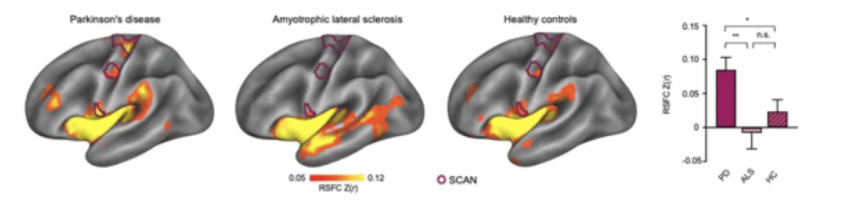 在本研究中,北京大学第三医院樊东升教授及其国内顶尖的渐冻症(ALS)研究团队,将渐冻症纳入对照分析。通过跨疾病的系统比较明确揭示:躯体认知环路紊乱是帕金森病特有的核心病理特征,而非神经退行性疾病的共性表现。与帕金森病不同,渐冻症呈现出截然不同的病理生理机制,揭示了两种疾病在致病通路和神经环路受损模式上的本质差异。