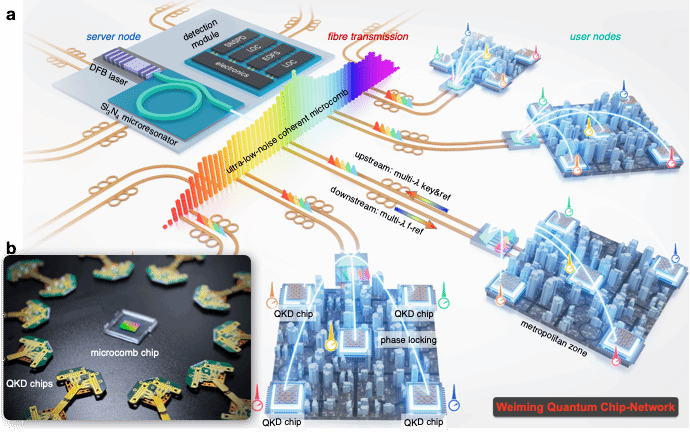 2026年2月11日,物理学院现代光学研究所王剑威教授、龚旗煌教授团队与电子学院常林研究员团队在《自然》上发表了题为《基于集成光量子芯片的大规模量子通信网络》(“Large-scale quantum communication networks with integrated photonics”)的突破性研究成果。研究团队成功研制出全功能集成的高性能量子密钥发送芯片与光学微腔光频梳光源芯片,并构建了全球首个基于集成光量子芯片的大规模量子密钥分发网络——“未名量子芯网”。该量子网络支持20个芯片用户并行通信,两两通信距离达370公里并打破无中继界限,组网能力(客户端对数×通信距离)达3700公里,在芯片用户规模与组网能力上均达到国际领先水平。