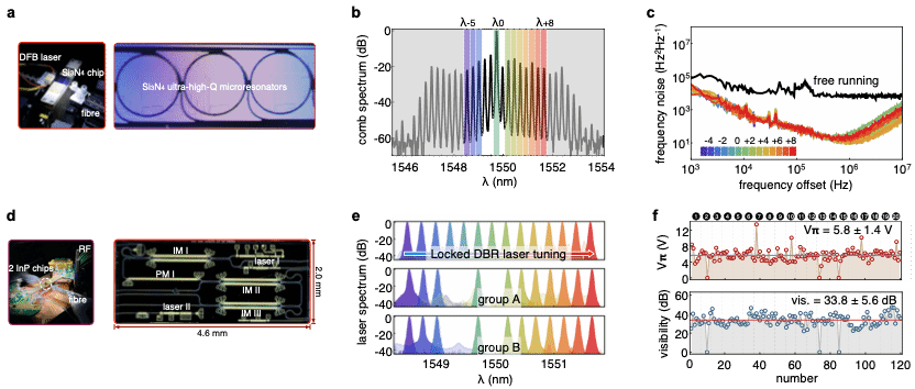 团队在中心服务器节点采用高品质因子氮化硅光学微腔频率梳作为种子光源阵列,通过自注入锁定方式产生线宽达赫兹量级的超低噪声相干暗脉冲频率梳,频率梳经下行光纤分发至各用户节点并完成解复用。用户端采用了20个独立的磷化铟光量子芯片,每个QKD芯片单片集成了激光器、调制器、衰减器、密钥编码与解码器件等全部功能模块,实现了晶圆级制造、高良率、低成本、高性能的QKD芯片解决方案。系统基于弱相干态完成量子态编码,编码后的信号经上行光纤发送至服务器端,最终实现单光子干涉与测量。