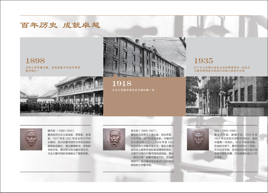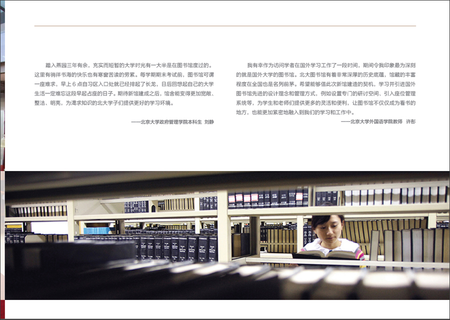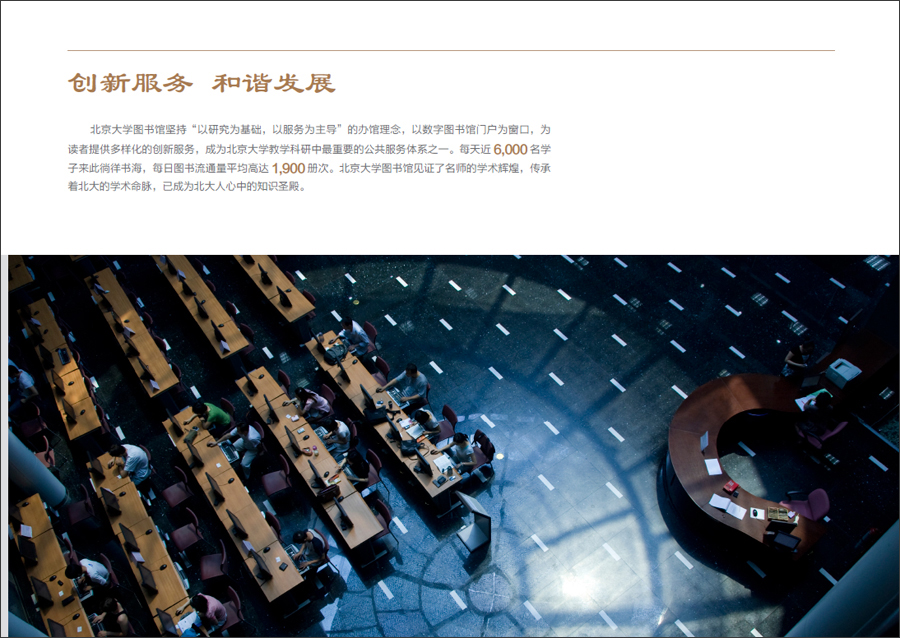 北京大学图书馆坚持“以研究为基础,以服务为主导”的办馆理念,以数字图书馆门户为窗口,为读者提供多样化的创新服务,成为北京大学教学科研中最重要的公共服务体系之一。每天近6,000名学子来此徜徉书海,每日图书流通量平均高达1,900册次。北京大学图书馆见证了名师的学术辉煌,传承着北大的学术命脉,已成为北大人心中的知识圣殿。