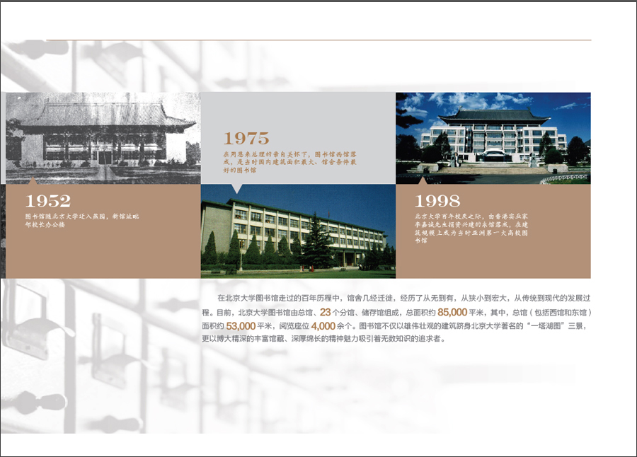 在北京大学图书馆走过的百年历程中,馆舍几经迁徙,经历了从无到有,从狭小到宏大,从传统到现代的发展过程。目前,北京大学图书馆由总馆、23 个分馆、储存馆组成,总面积约85,000 平米,其中,总馆(包括西馆和东馆)面积约53,000 平米,阅览座位4,000 余个。图书馆不仅以雄伟壮观的建筑跻身北京大学著名的“一塔湖图”三景,更以博大精深的丰富馆藏、深厚绵长的精神魅力吸引着无数知识的追求者。