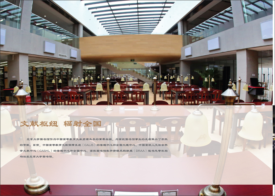 北京大学图书馆作为中国高等教育文献资源共享的重要枢纽,为高校图书馆事业的发展做出了积极的贡献。目前,中国高等教育文献保障系统(CALIS)的管理中心和全国文理中心、中国高校人文社会科学文献中心(CASHL)的管理中心和全国中心、高校图书馆数字资源采购联盟(DRAA)秘书处等机构均设在北京大学图书馆。