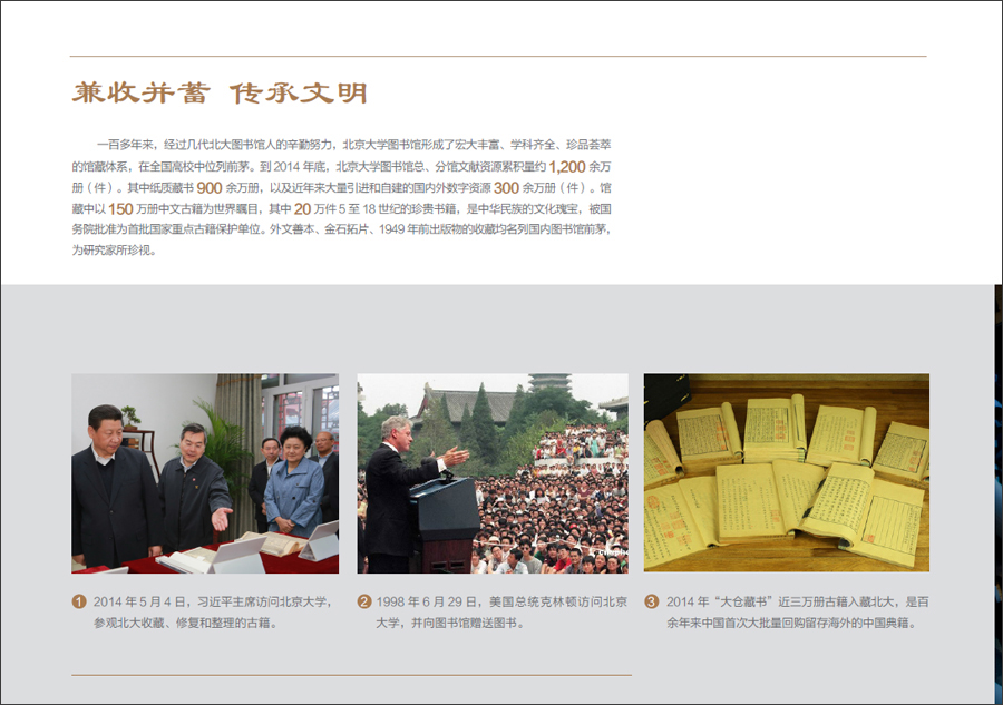 一百多年来,经过几代北大图书馆人的辛勤努力,北京大学图书馆形成了宏大丰富、学科齐全、珍品荟萃的馆藏体系,在全国高校中位列前茅。到2014 年底,北京大学图书馆总、分馆文献资源累积量约1,200 余万册(件)。其中纸质藏书900 余万册,以及近年来大量引进和自建的国内外数字资源300 余万册(件)。馆藏中以150万册中文古籍为世界瞩目,其中20万件5至18世纪的珍贵书籍,是中华民族的文化瑰宝,被国务院批准为首批国家重点古籍保护单位。外文善本、金石拓片、1949 年前出版物的收藏均名列国内图书馆前茅,为研究家所珍视。