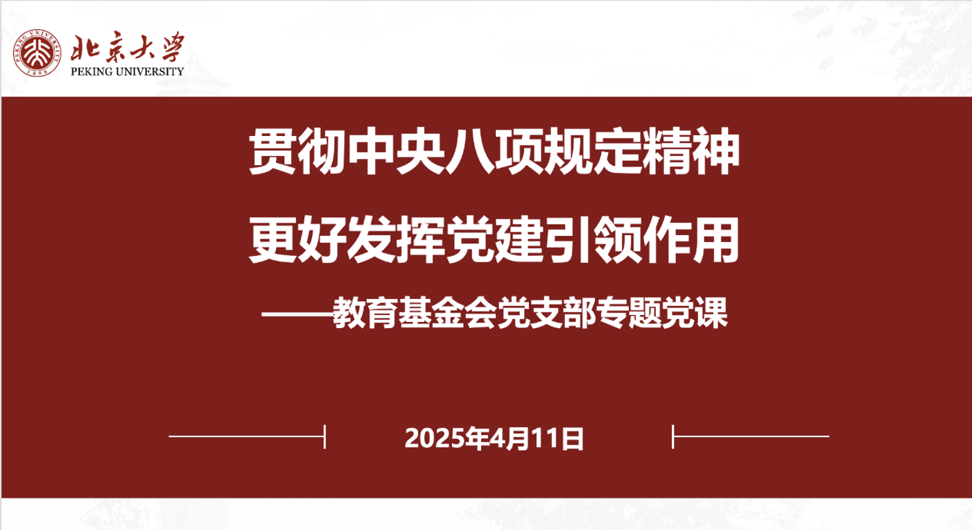 为深入贯彻中央八项规定精神,更好发挥党建引领作用,北京大学教育基金会党支部于4月11日下午召开全体党员大会,开展集体学习教育活动。大会由基金会党支部书记、副秘书长胡俊主持并作专题讲座,基金会全体党员参加。