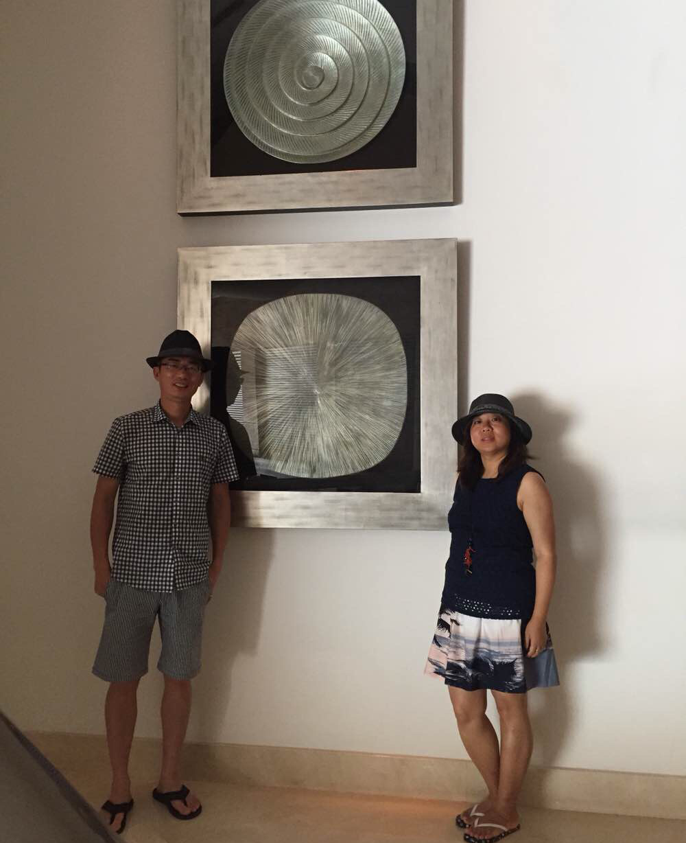 杨瑞祥伉俪在墨西哥坎昆Fiesta coral beach 度假酒店自己设计的产品前合影,这家五星酒店装饰一千多幅万石画艺的墙饰产品。