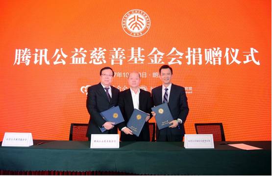 10月28日,腾讯公益慈善基金会北京大学捐赠仪式在北京大学国家发展研究院朗润园举行。北京大学党委书记郝平、北京大学国家发展研究院院长姚洋、腾讯公司高级副总裁郭凯天、腾讯研究院院长司晓等共同出席了此次捐赠活动。