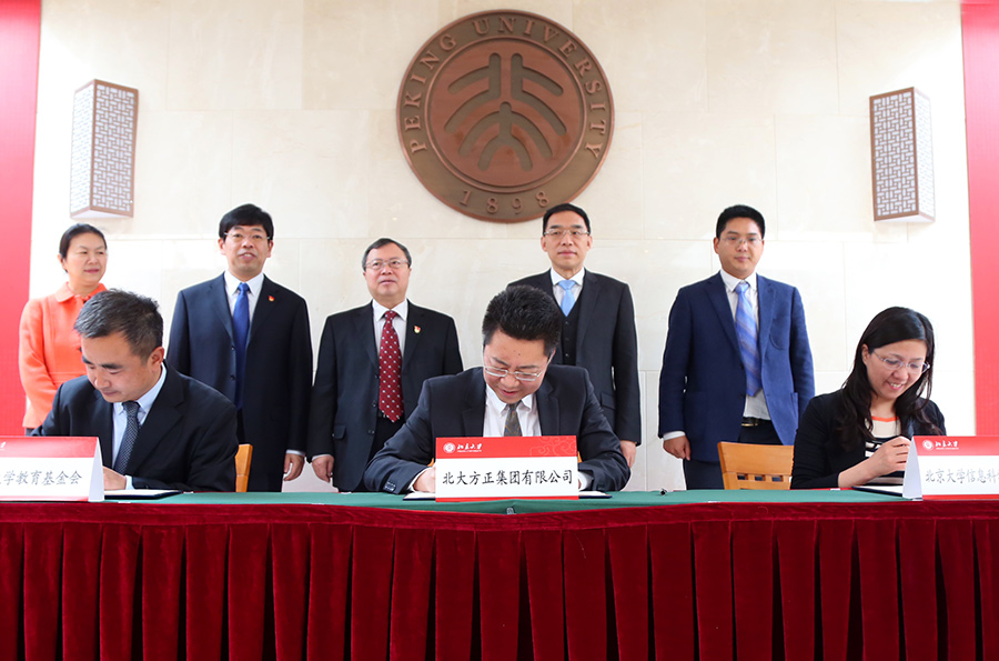 在全场热烈的掌声中,生玉海董事长、黄如院长和李宇宁秘书长共同签署捐赠协议。王仰麟副校长向方正集团颁发北京大学杰出教育贡献奖。
