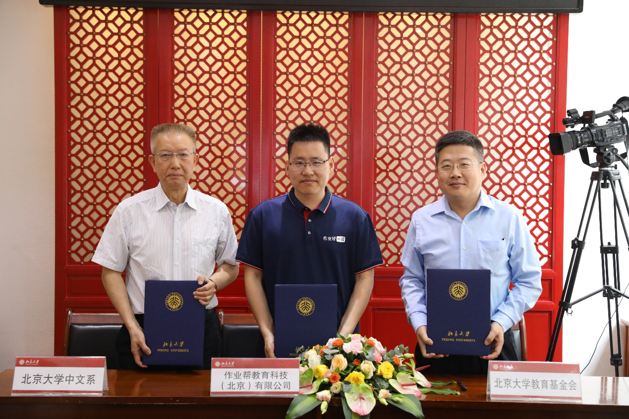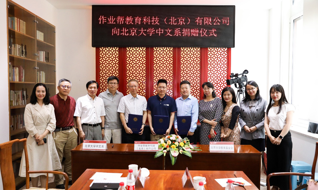 5月30日,作业帮教育科技(北京)有限公司向北京大学中国语言文学系捐赠仪式在人文学苑举行。作业帮创始人、CEO侯建彬,作业帮联合创始人所晖,北京大学教育基金会副秘书长王勇,中文系主任陈晓明、党委书记金永兵、副主任张辉等企业、教师代表共同见证签约仪式。捐赠仪式由中文系副主任杜晓勤主持。