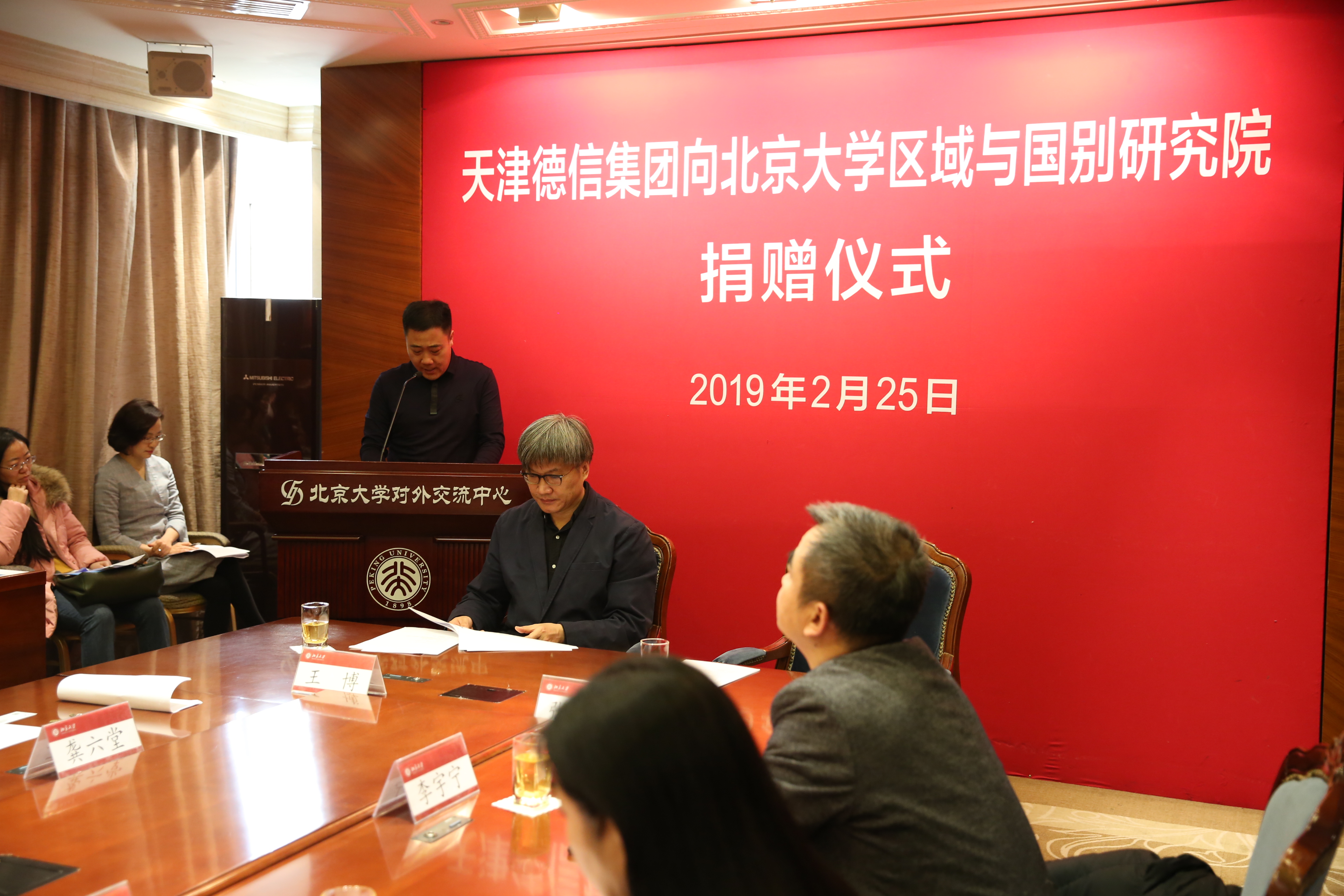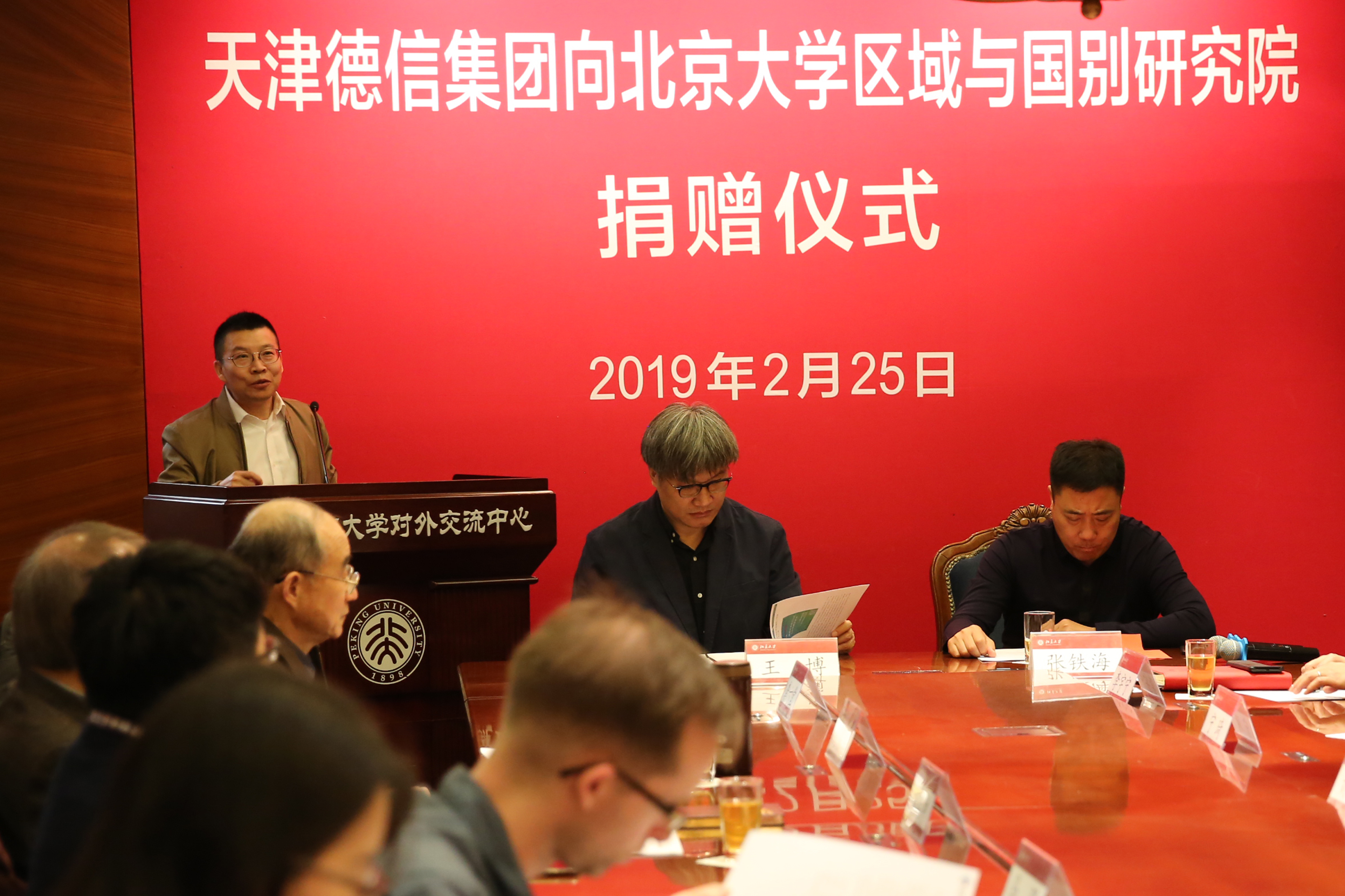 2月25日,天津德信集团有限公司向北京大学区域与国别研究院捐赠仪式在英杰交流中心星光厅举行。天津德信集团董事长张铁海,北京大学副校长、教育基金会副理事长王博,区域与国别研究院院长钱乘旦、常务副院长宁琦,社会科学部部长龚六堂,教育基金会秘书长李宇宁等共同出席。