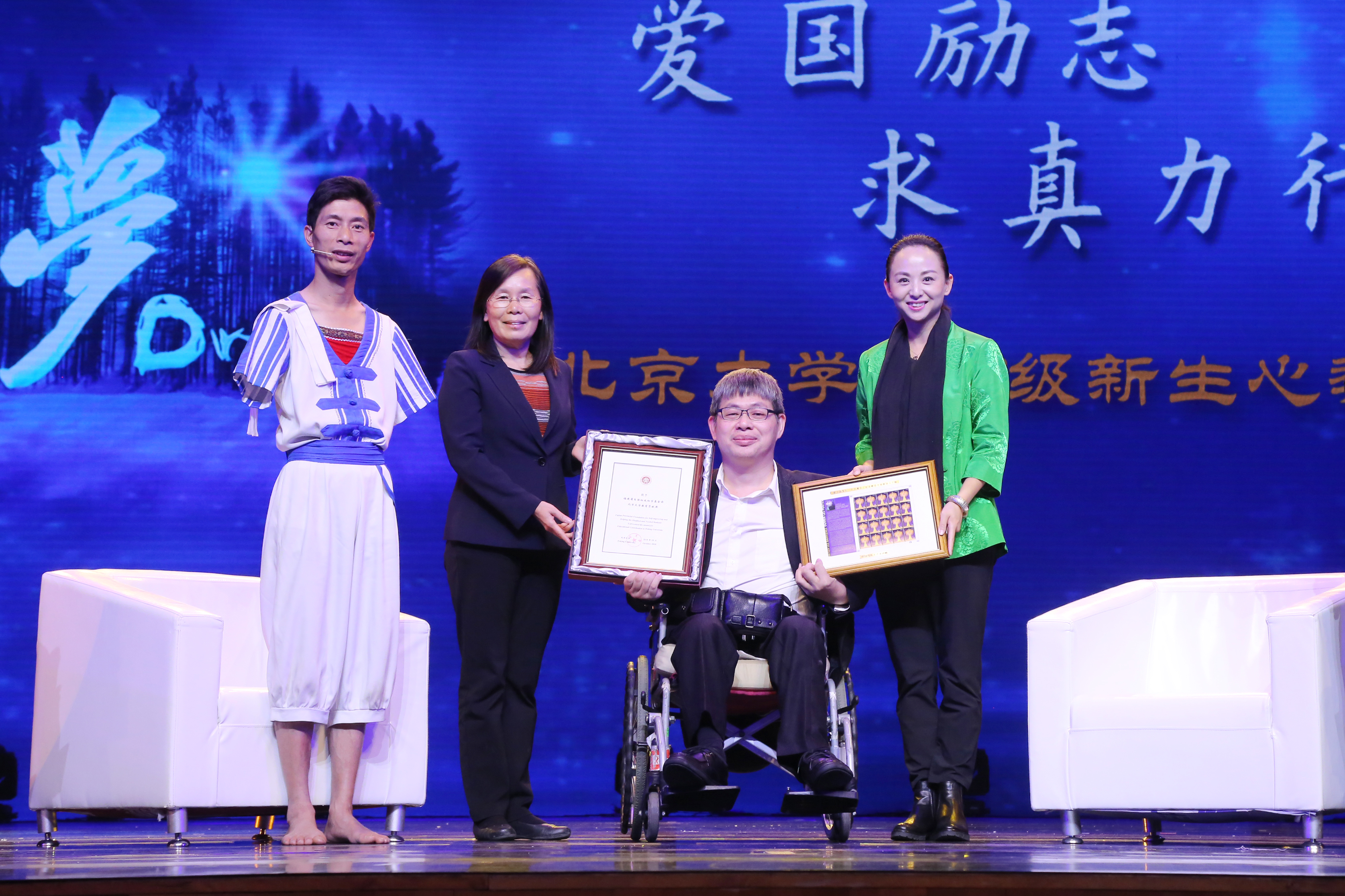 10月14日晚,“爱国、励志、求真、力行”北京大学2018级新生心教育晚会在北京大学百周年纪念讲堂举行。中国残联副主席吕世明,北京大学党委副书记、纪委书记叶静漪,新东方教育集团董事长俞敏洪等近2000人参加了活动。福建省自强助残助学基金会创始人、副理事长郑声滔教授代表福建省自强助残助学基金会宣布向北京大学捐资500万元设立“无障·爱”人文基金,支持北京大学人口研究所开展无障碍方向的研究、评估、规划、活动和人才培养等项目。叶静漪副书记向郑声滔教授颁发“北京大学教育贡献奖”,中国残疾人艺术团团长邰丽华向他赠送纪念品。