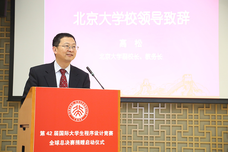 高松副校长感谢新一代中国高科技企业对教育事业的大力支持,并介绍了北京大学对ACM国际大学生程序设计竞赛在全国范围内的推广。高松副校长指出,北大一直将此项竞赛作为提升计算机科学教学质量的一个重要方式。如今,竞赛获奖学生已成长为学校和企业之间合作的桥梁,促进了IT企业和北大在计算机教育方面的合作。高松副校长表示,北大在2018年承办总决赛,希望以此来推动计算机教育在中国的普及,激发更多学生学习计算机的热情,培养学生的算法思维,为国家人工智能战略培养和输送更优质的后备人才。